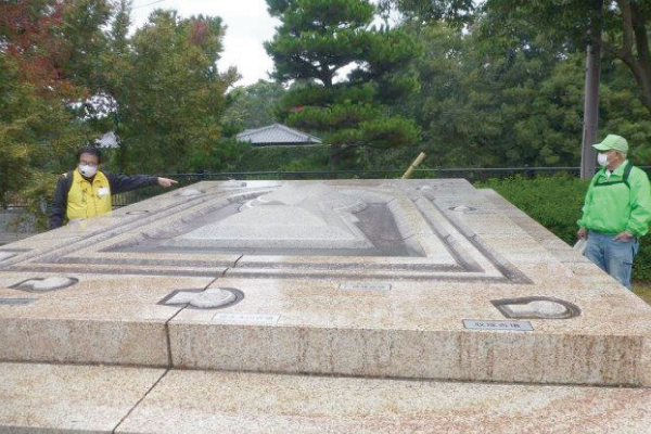 拝所のほど近くにある主墳と陪家の位置関係が分かる立体の案内図の前での説明。墳丘と三重の周濠の様子も良く分かります。