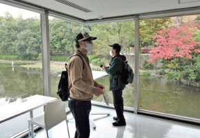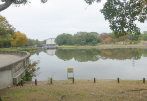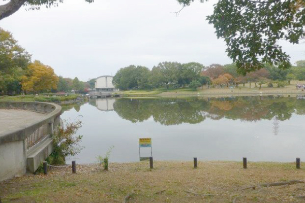 大仙公園にて。江戸時代のため池を改修して造られた「どら池」から見る堺市博物館(後方の白い建物)